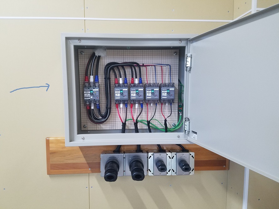 お客様の契約が電灯用のみでしたので、動力用の契約も新たに申請し、引込線取付点から分電盤までの引込口配線工事も併せて行う事になりました。